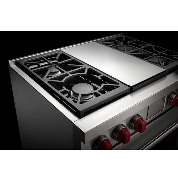 Газовая варочная поверхность состоит из четырёх горелок, мощностью от 2,7 кВ (для топления) до 5,3 кВ (для быстрого закипания и интенсивной обжарки) . Запатентованная двухуровневая конструкция газовой горелки Wolf позволяет максимально точно контролировать температуру нагрева. Система искрового реподжига автоматически зажигает горелку при её заливе. Увеличенная площадь теппана обеспечивает равномерное распределение тепла, позволяя быстро приготовить сразу несколько блюд для большой семьи или гостей.
