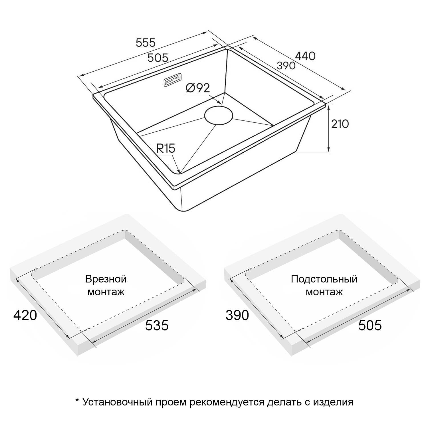 Мойка создана как для современного способа монтажа под столешницу, так и для классического врезного монтажа.