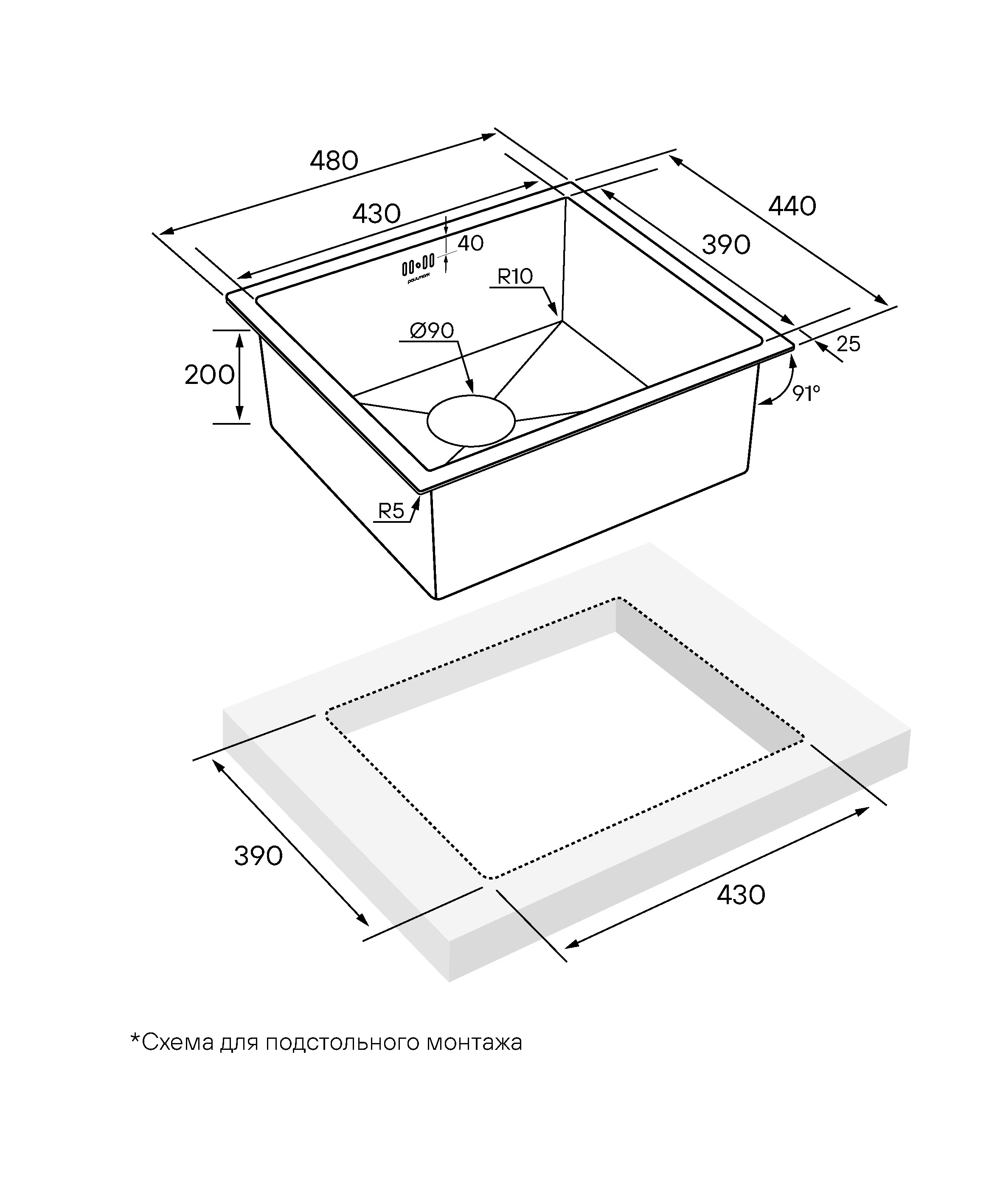 Оптимальный размер мойки 480х440мм подходит для любого кухонного пространства. Возможен подстольный, накладной монтаж или монтаж вровень со столешницей.