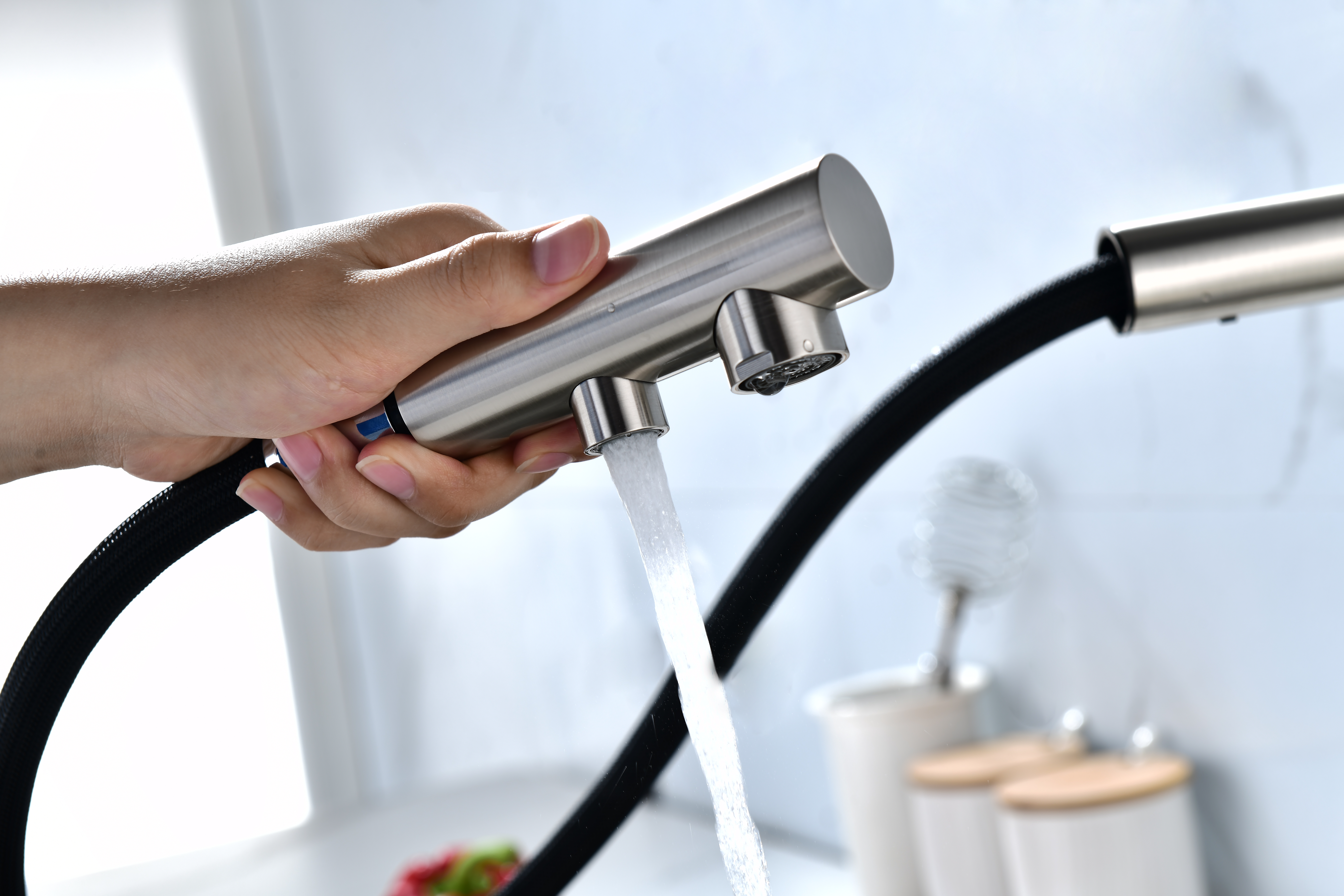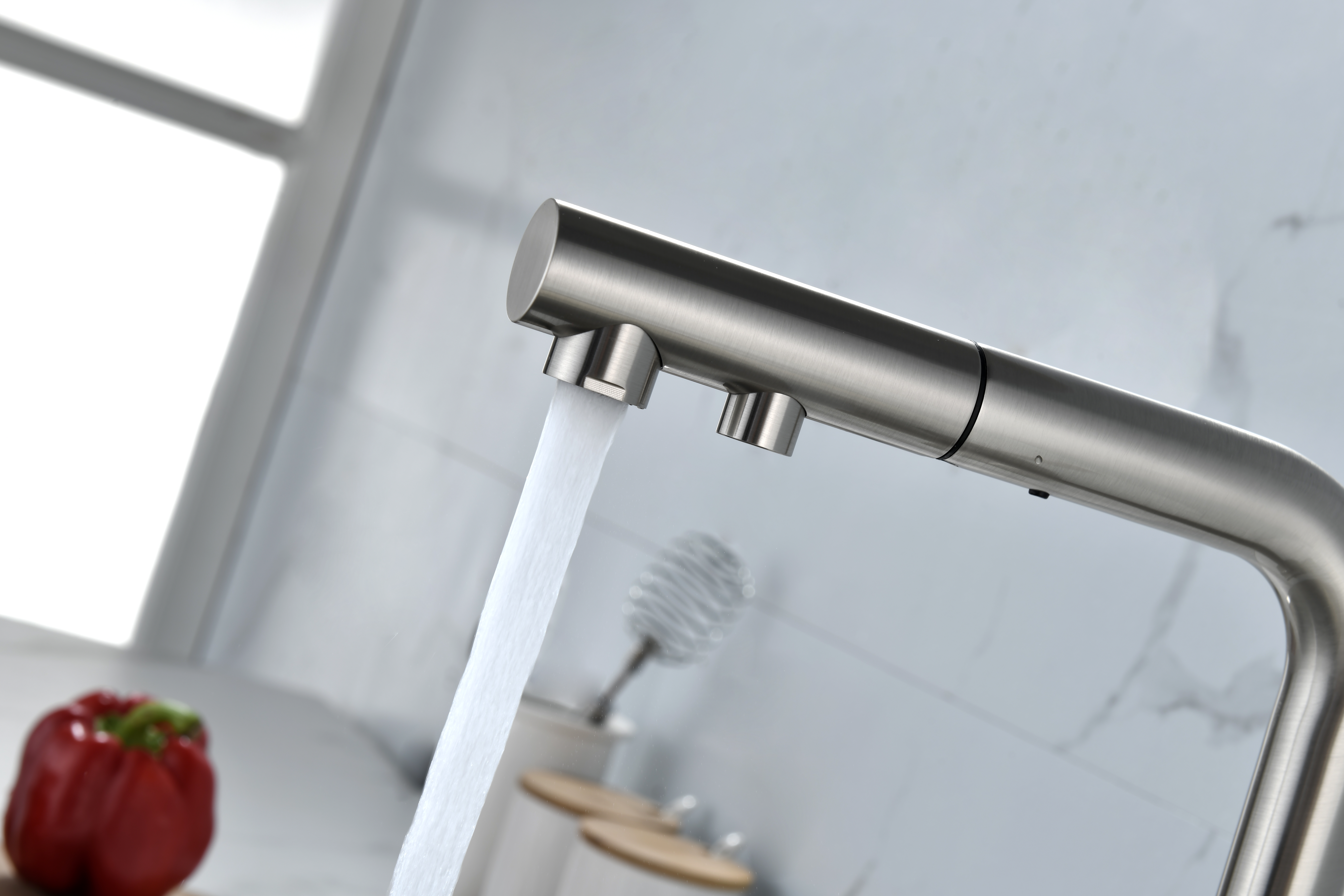 Смеситель оснащен гибким выдвижным изливом из нейлоновой оплетки, которая обладает отличной устойчивостью к истиранию и разрушению. Данная техническая особенность расширяет рабочую зону смесителя, позволяя пользоваться им с удобством в больших мойках, мойках с двумя чашами, или наполнять водой ёмкость на столе рядом с мойкой, в том числе питьевой водой.
