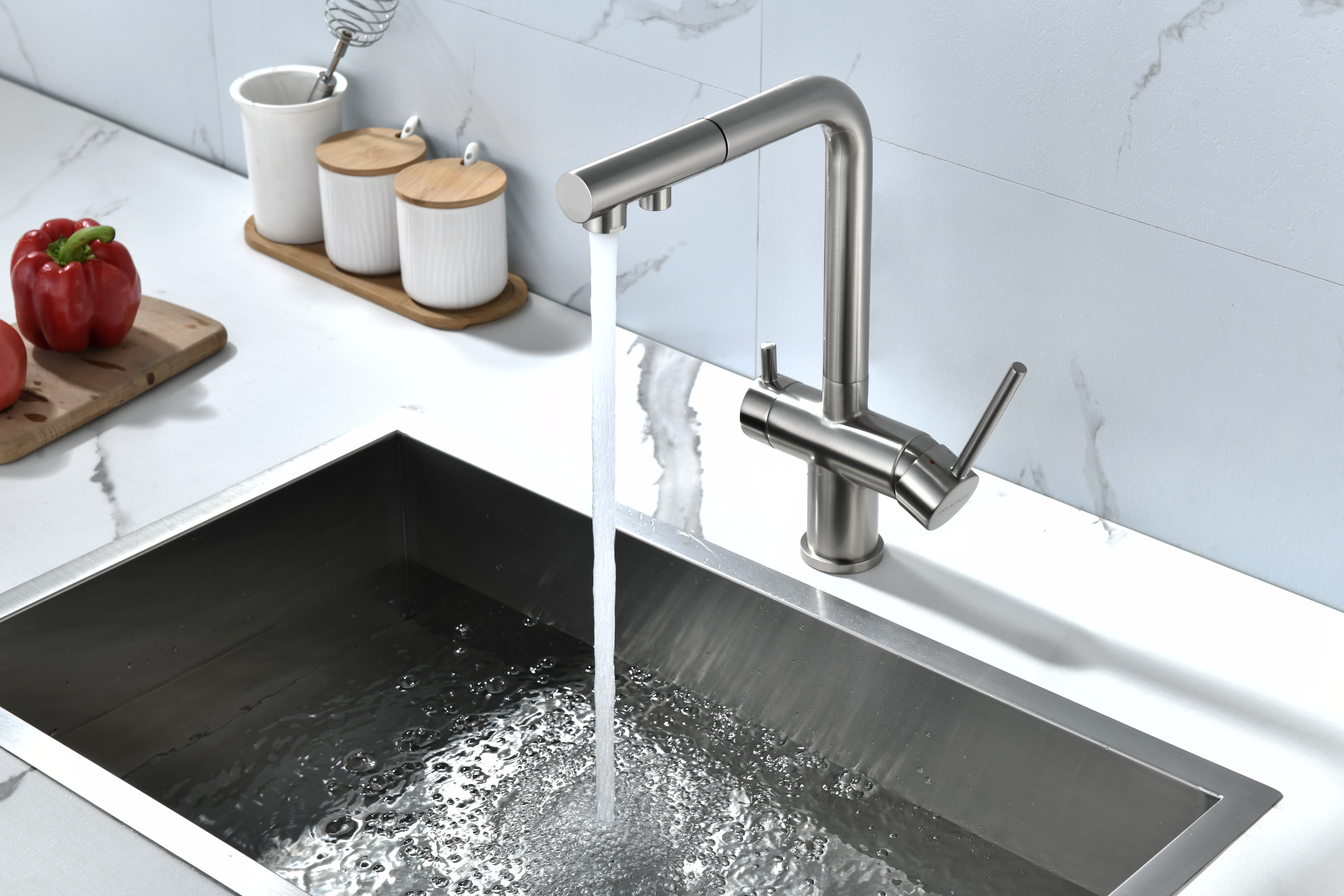 SERPENTINE оснащён функцией TRINKWASSER - излив смесителя имеет встроенный независимый канал для питьевой воды из фильтра, таким образом питьевая и водопроводная вода не смешиваются. Управление питьевой водой осуществляется отдельным рычагом, расположенным слева. Для пуска водопроводной воды используется большой рычаг справа.
