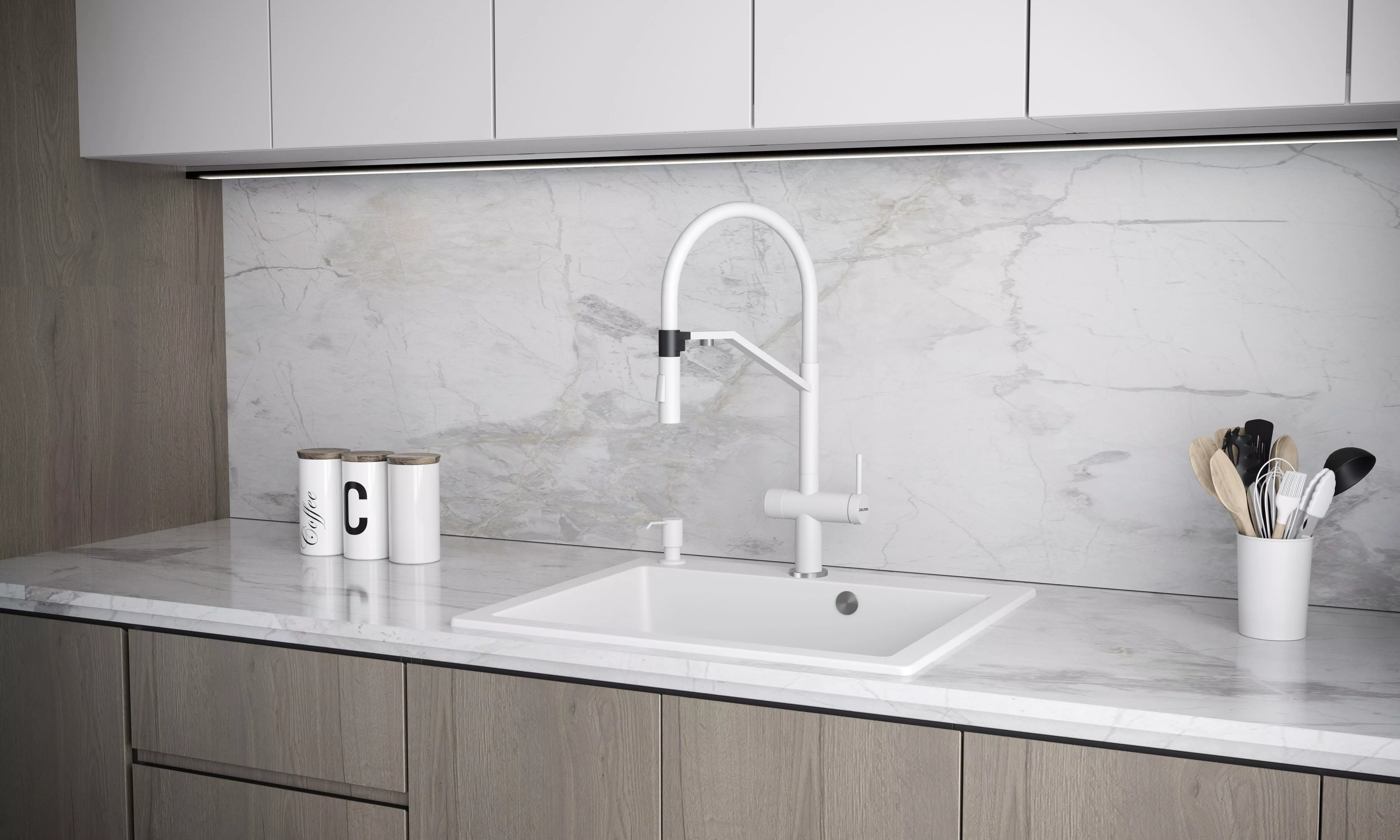 Многофункциональный смеситель для кухни ZENDER оснащен функциями подключения фильтра питьевой воды и гибким силиконовым изливом с двумя режимами подачи водопроводной воды: струя и душ. Для переключения между этими режимами предусмотрена удобная кнопка на конце излива. Управление подачей очищенной питьевой воды осуществляется поворотом специальной ручки, расположенной слева и имеющей декоративные лазерные насечки, при этом вода подается через отдельный аэратор.